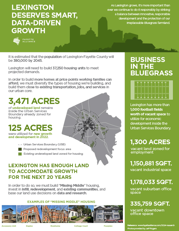Fayette Alliance is a 501(c)(3) nonprofit dedicated to achieving smart, sustainable, and equitable growth in Lexington-Fayette County through land-use advocacy, education, and research. We fund research to provide objective data to support our advocacy work and inform decisions around land-use policy in Lexington-Fayette County.