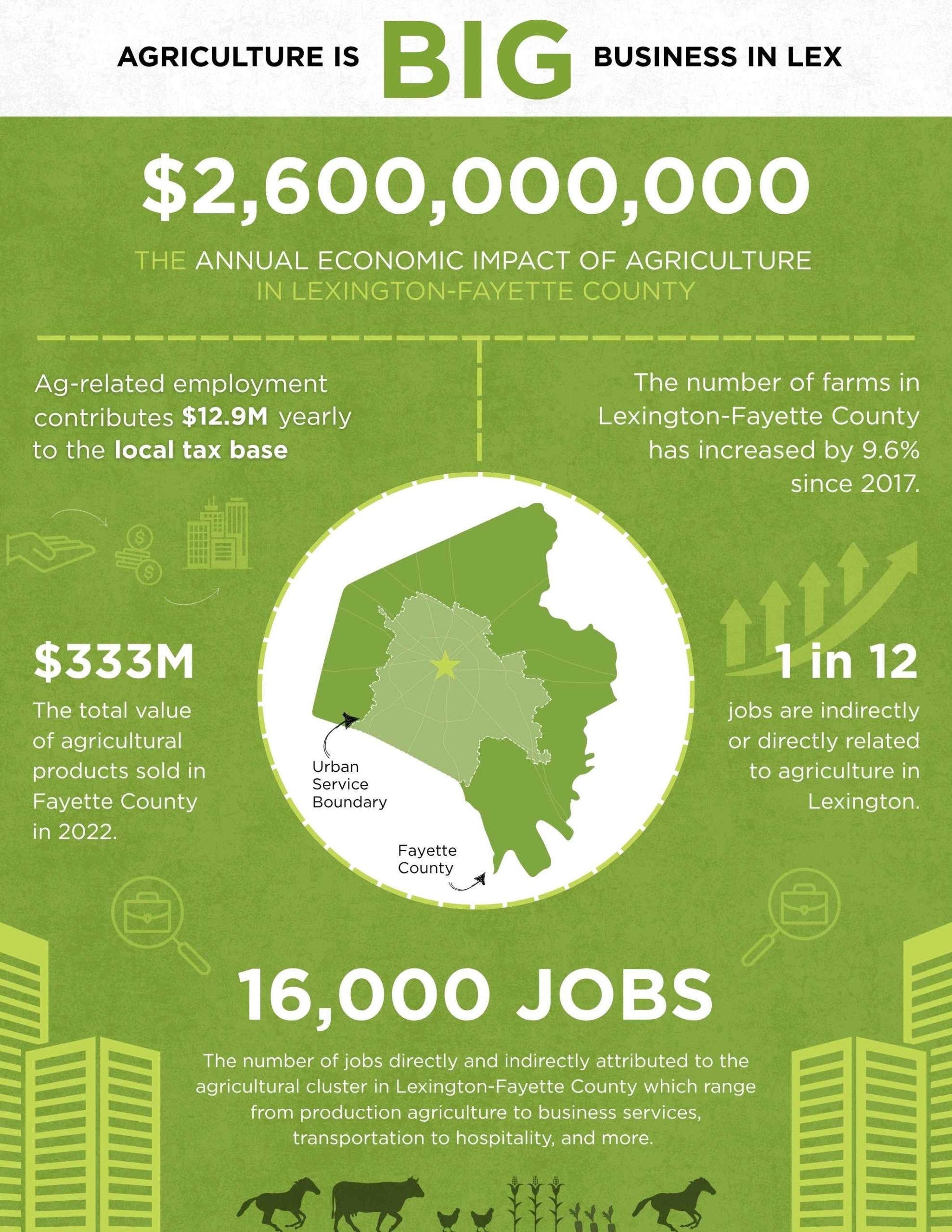 The jobs and economic impacts created by agriculture are connected to dozens of other industries throughout the Lexington community – manufacturing, trucking, local food, education, insurance, accounting, real estate, and more.
